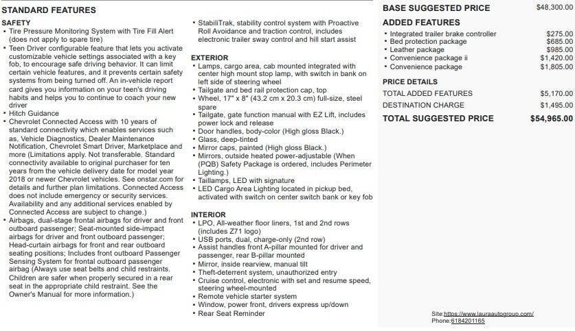 Carfax 1 Owner New Vehicle Trade! Silverado 1500 LT Trail Boss, Crew Cab, 5.3 Ecotec, 4WD, 8 Speed Automatic, Heated Front Seats, Heated Steering Wheel, Leather Seating, Remote Start, Spray-In Bed Liner, Dual Zone Automatic Climate Control, Trailer Brake Controller, Remote Keyless Entry, Power Windows, Power Locks, Power Mirrors. This vehicle has good tires, is in good condition and is ready for many more miles! This Silverado 1500 has a clean vehicle history report and does not have any accidents. Call us today, this vehicle won't last long at this price 573-677-1310! Laura Automotive Group, serving our communities for over 43 years!! We are a family owned dealership committed to providing our customers the best deals backed by outstanding service!