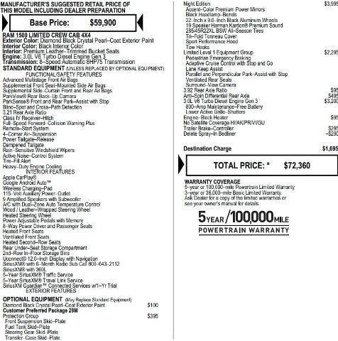 Recent New Vehicle Trade! Ram 1500 Limited, 3.0 Ecodiesel, 4WD, 8 Speed Automatic, Heated And Cooled Leather, Trailer Brake Controller, Adaptive Cruise Control, Uconnect 12 NAV, Front And Rear Park Assist, Air Suspension, Remote Start, Rear View Camera, Dual Zone Automatic Climate Control, ALPINE Premium Audio, Remote Keyless Entry, Power Windows, Power Locks, Power Mirrors. This vehicle has good tires, is in good condition and is ready for many more miles! This Ram 1500 has a clean vehicle history report and does not have any accidents. Call us today, this vehicle won't last long at this price 573-677-1305! Laura Automotive Group, serving our communities for over 43 years!! We are a family owned dealership committed to providing our customers the best deals backed by outstanding service!