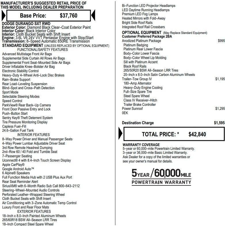 Carfax 1 Owner Recent Trade! Durango SXT, 3.6 V6, RWD, 8 Speed Automatic, Power Sunroof, ALPINE Premium Audio, Trailer Tow Package, Trailer Brake Controller, Tri Zone Automatic Climate Control, Rear View Camera, Leather Wrapped Steering Wheel With Audio Controls, LED Headlamps, Remote Keyless Entry, Power Windows, Power Mirrors. This vehicle has good tires, is in good condition and is ready for many more miles! This Durango has a clean vehicle history report and does not have any accidents. Call us today, this vehicle won't last long at this price 573-677-1305! Laura Automotive Group, serving our communities for over 43 years!! We are a family owned dealership committed to providing our customers the best deals backed by outstanding service!