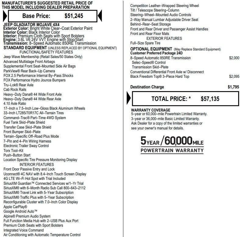 Carfax 1 Owner New Vehicle Trade! Gladiator Mojave, 3.6 V6, 4WD, 8 Speed Automatic, Hard Top, Rear View Camera, Uconnect 4C NAV, Sirius XM Radio, ALPINE Premium Audio, Steering Wheel Mounted Audio Controls, Automatic Climate Control, Remote Keyless Entry, Power Windows, Power Locks, Power Mirrors. This vehicle has good tires, is in good condition and is ready for many more miles! This Gladiator has a clean vehicle history report and does not have any accidents. Call us today, this vehicle won't last long at this price 573-677-1305! Laura Automotive Group, serving our communities for over 43 years!! We are a family owned dealership committed to providing our customers the best deals backed by outstanding service!